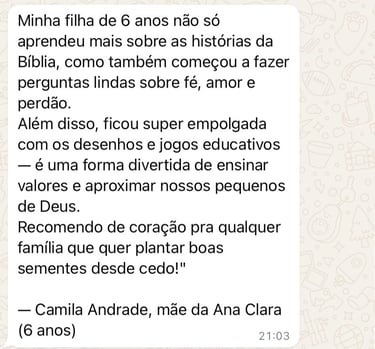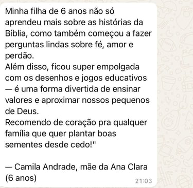 Você vai acompanhar passo a passo as principais histórias da Bíblia contadas de forma leve, ilustrada e acessível, mesmo que nunca tenha ensinado sobre fé antes. Prepare-se para ver seus filhos embarcarem em aventuras com Noé, Davi, Ester e muitos outros heróis da fé!
